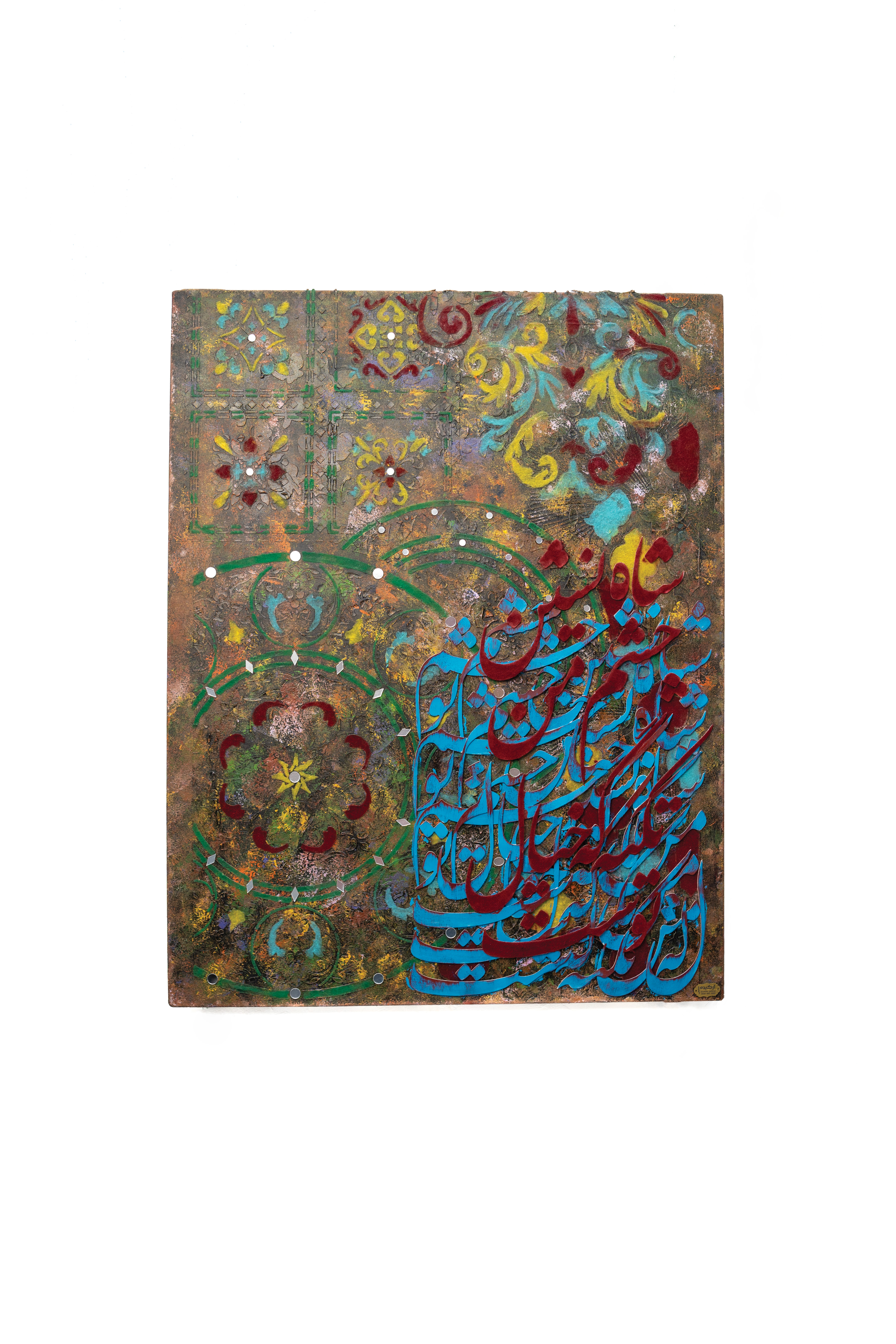 کارشده روی بوم هست از خط برجسته روی کار استفاده شده و اینه کاری شده نوشته روی کار با پودر مخمل رنگ شده